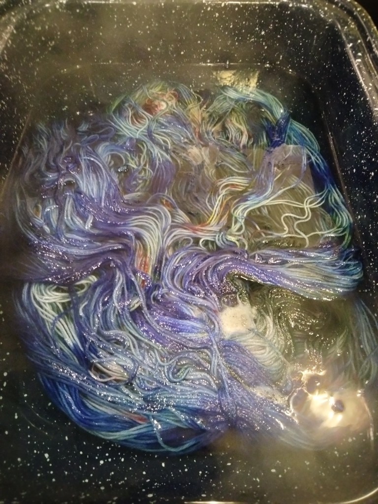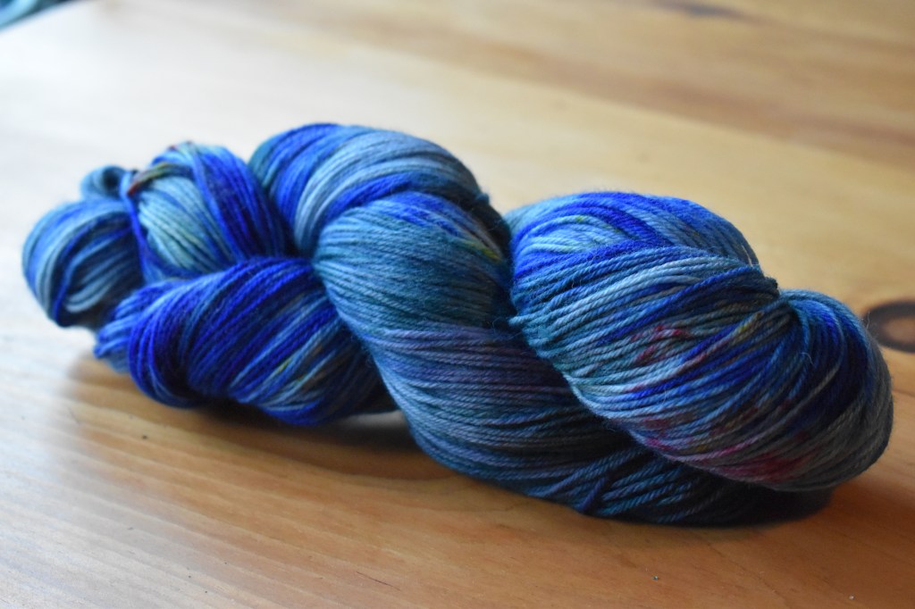 Speaking of which, I’ve played again in our basement as Grandpa Munster mixing colors and came up with this skein in an attempt to create a variegated blue for the small version of Ishbel for one of my sisters. The problem is, I’ve also seen a gorgeous tonal blue skein at our local yarn shop (LYS), Spun, one of the best shops around, which is half-a-mile from my house. That skein is maybe a little too expensive, maybe made from fibers just a little too luxurious, or maybe not.